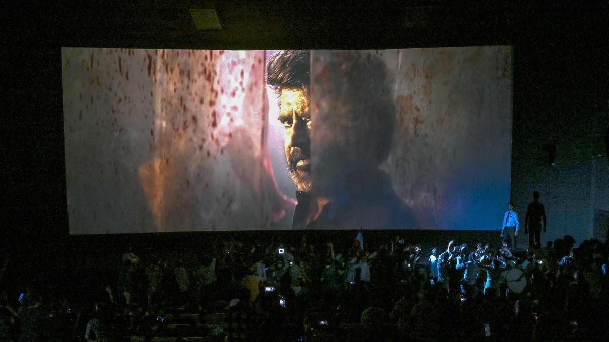 Fans dance inside a theater during Rajinikanth’s new film, ‘Coolie’, photo credit: Indranil Mukherjee