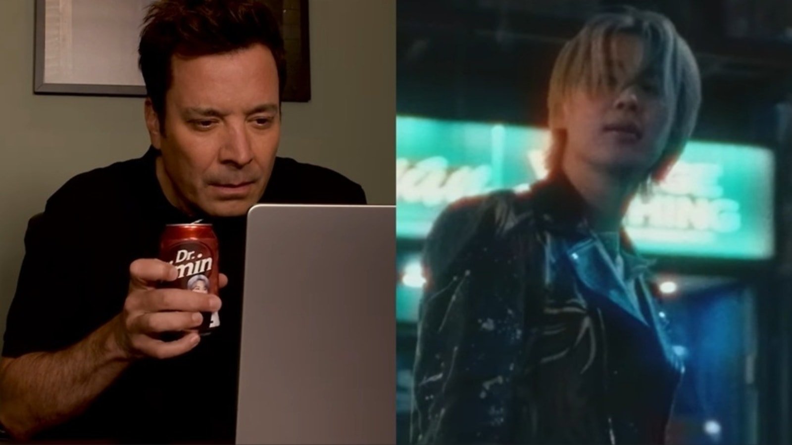 On Instagram, Jimmy Fallon posted a short clip of himself and Jimin. The video begins with Jimmy sitting in front of his laptop, drinking water from a can that says ‘Dr Jimin’ and watching a teaser for Who. A photo frame of Jimin hangs on the wall behind him.