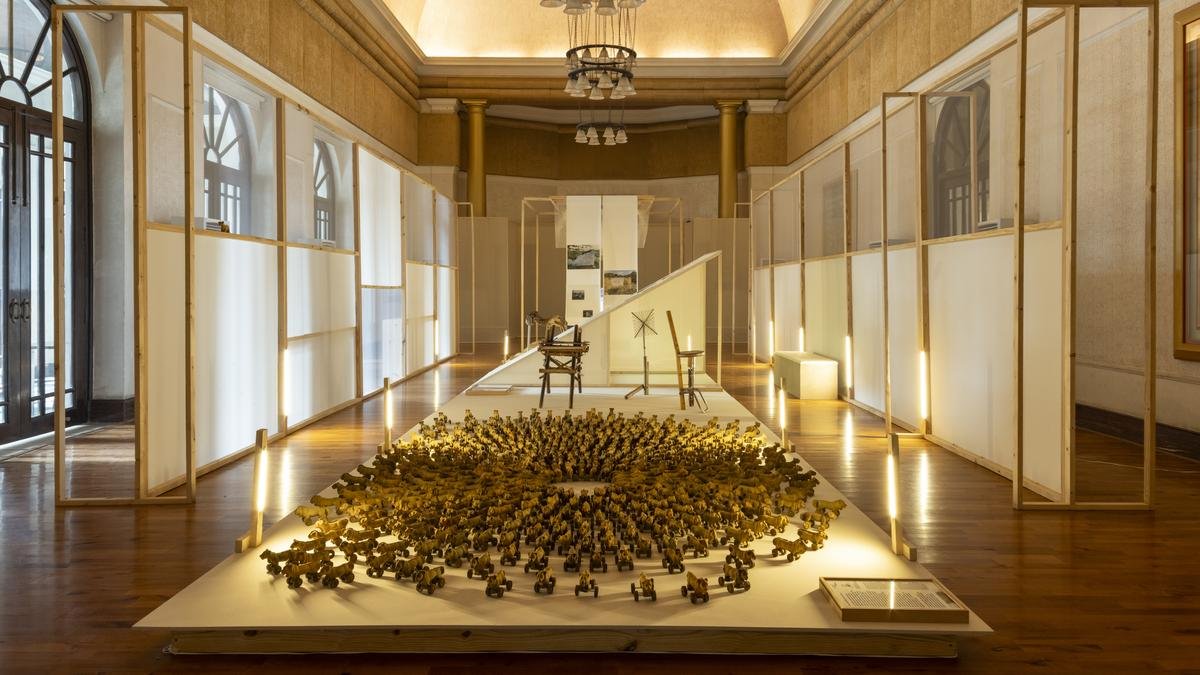Another head turner Mari wadi ma. Hundreds of small clay sculptures glow outward from an empty circle in the center of the luminous space. Their size forces you to get down on the ground…only to see that they are actually a pride of 550 lions. By visual artist Mrigen Rathod, it alludes to single-species conservation in the Gir forests of Gujarat, which is an ecological problem as it ignores ecosystem-level health, leading to Asiatic lions moving out of their habitat and encroaching on nearby mango orchards. mango-lion Made from Gir soil.